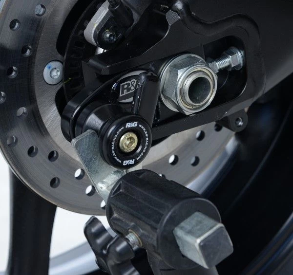 Wanneer er geen schroefdraad in de achterbrug is om een bobbin te monteren kan de R&G “Offset Cotton Reels” gebruikt worden. Zo kan er via de kettingspanner/achteras toch een bobbin op de motor gemonteerd worden en kan de motor dus met een paddockstand veilig en stevig gestald worden. Ook beschermen de bobbins de achterbrug bij een val.