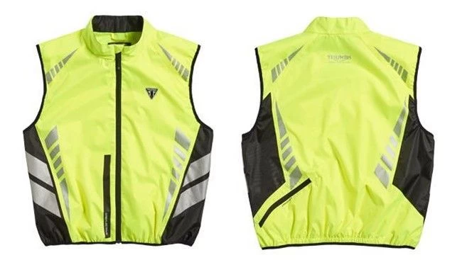Het Triumph reflectievest is een hi-viz (zeer zichtbaar) rijvest. De natuurlijke ultraviolette stralen van de zon reageren met fluorescerende materialen in dit kledingstuk, waardoor ze helderder lijken en als resultaat de zichtbaarheid gedurende de dag vergroot. Het effect is sterker bij weinig licht, zoals nat weer en mist. Met een ademende voering van mesh, elastische zoom en geprinte reflecterende details voor een betere zichtbaarheid ‘s nachts.